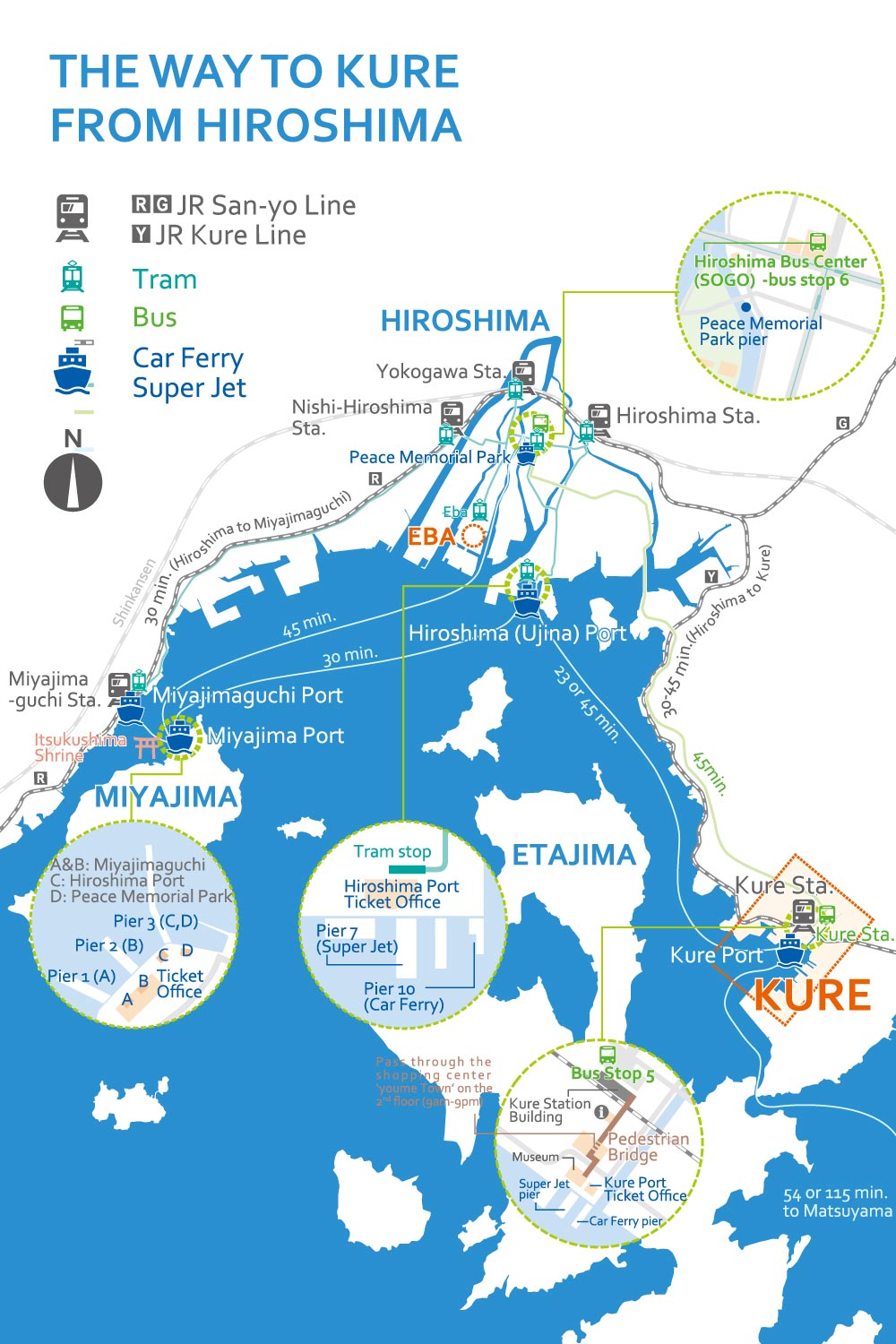 Kure is just a short hop from Hiroshima. If you are travelling from Tokyo, you can catch a flight to Hiroshima airport, or catch the bullet train to JR Hiroshima station. From Hiroshima airport, you can catch a bus to Kure station, and from Hiroshima station you can catch a JR train to Kure station.